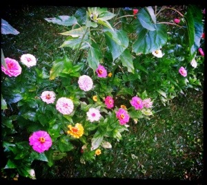 The zinnias bloom vibrant and cheerful, undaunted by a first early frost.