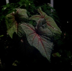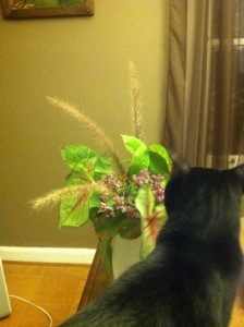 But speaking of glamour, and on a much happier note, it’s Flowers In The House over at Jane’s. So I headed out to my fading yard after dark, to see what I could collect for an early autumn bouquet to bring to the party. I tucked some sedum, dogwood leaves, caladium and red fountain grass fronds into a tall marbly vase that was a wedding gift.
