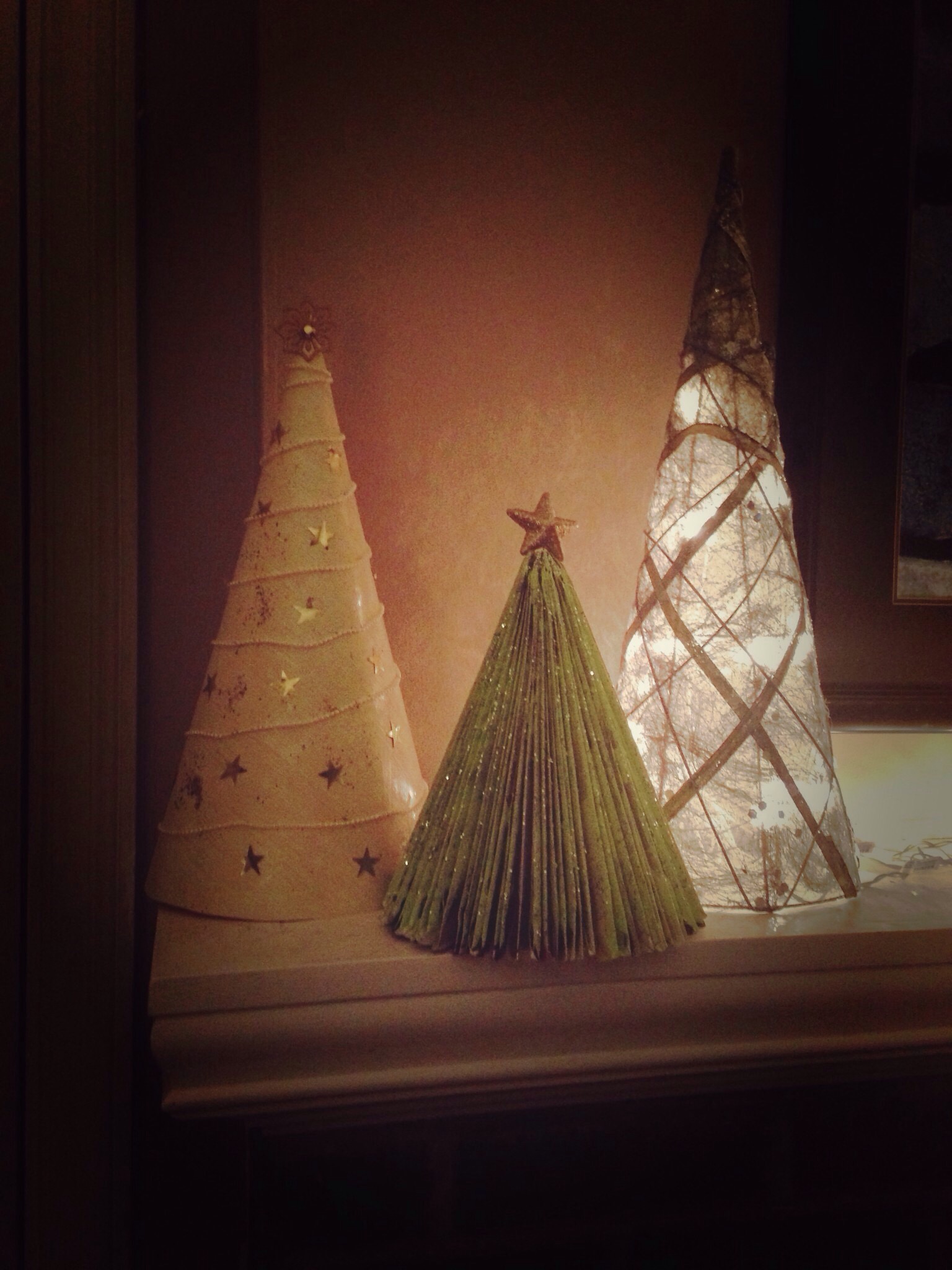 I love decorating for the holidays. This year I decided on trees for the mantle. I started with a mesh tree that my sister scouted out for me at Building Character. Today I scavenged through my craft supplies, determined not to go out to a craft store, and created three more trees. Tree one was made from pale gold wallpaper found at the Lancaster Creative Reuse store, and vintage beaded string, stars and glitter. It started out like this:
